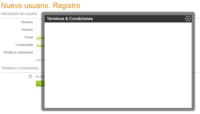 Hola de momento para ser la primera vez que pruebo este componente todo va casi bien , el problema es que no me muestra terminos y condiciones , en configuracion del componente tengo el texto para este fin pero no se muestra a la hora de registro, dejo una imagen del problema. gracias.