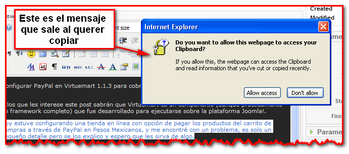 Perdón si no estoy en el lugar adecuado para hacer esta pregunta…. resutla lo siguiente… antes podia copiar una articulo o cualquier cosa y luego pegarlo, pero desde que instale el editor JCE ya no puedo hacerlo… puedo hacerlo usando el teclado es decir CTRL + C para copiar y CTRL + V para pegarlo… pero usando el mouse no puedo me envia el siguiente mensaje de error ver imagen